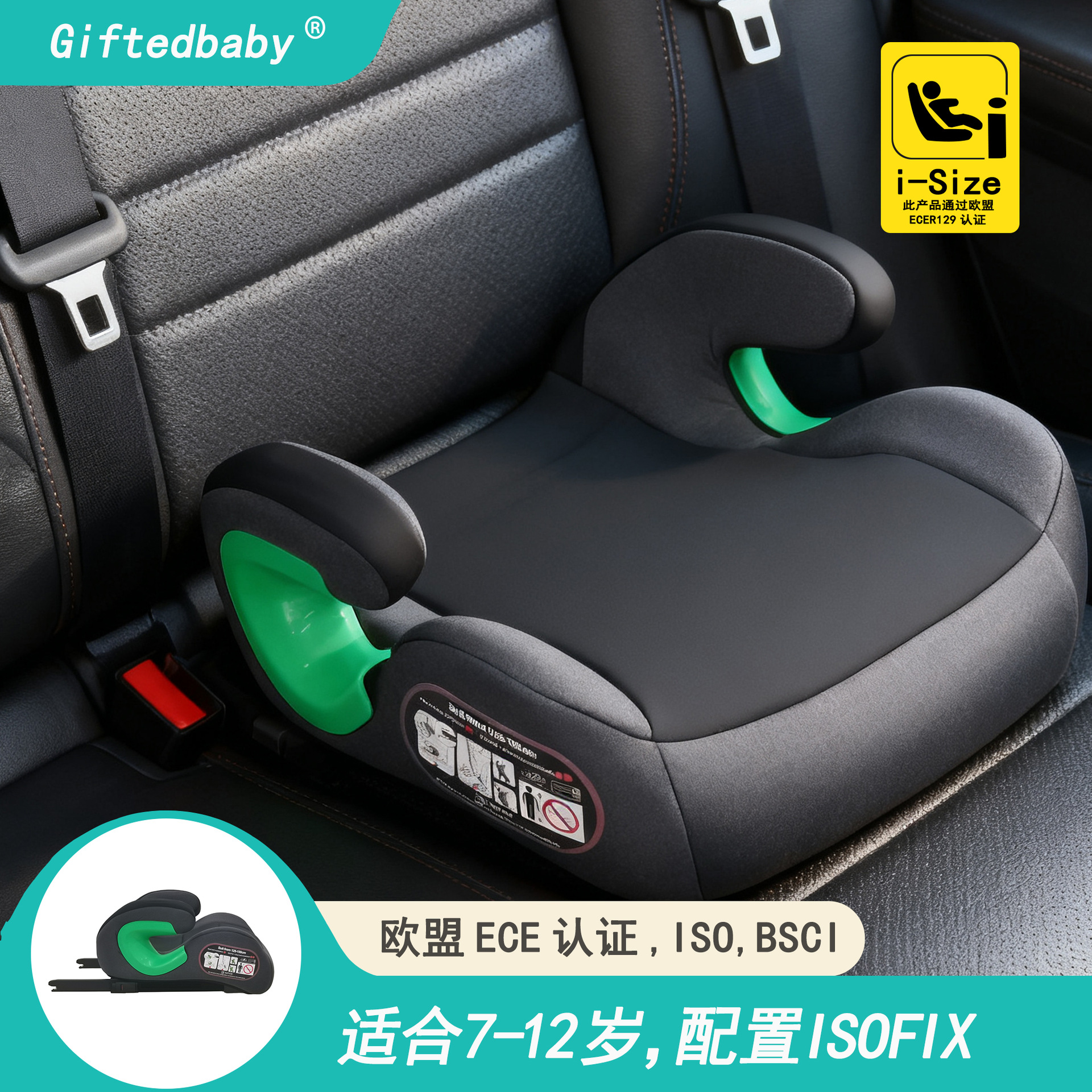 Ghế nâng cho trẻ em, giúp tăng chiều cao khi ngồi trong ô tô, đồng thời đảm bảo sự an toàn. Ghế có đệm màu đen và tay vịn màu xanh lá, thiết kế dành cho trẻ từ 7 đến 12 tuổi. Ghế này đáp ứng các chứng nhận an toàn của châu Âu như ECE R44/04, ISO và BSCI. Ghế cũng tích hợp hệ thống ISOfix để đảm bảo việc gắn chặt vào xe ô tô.